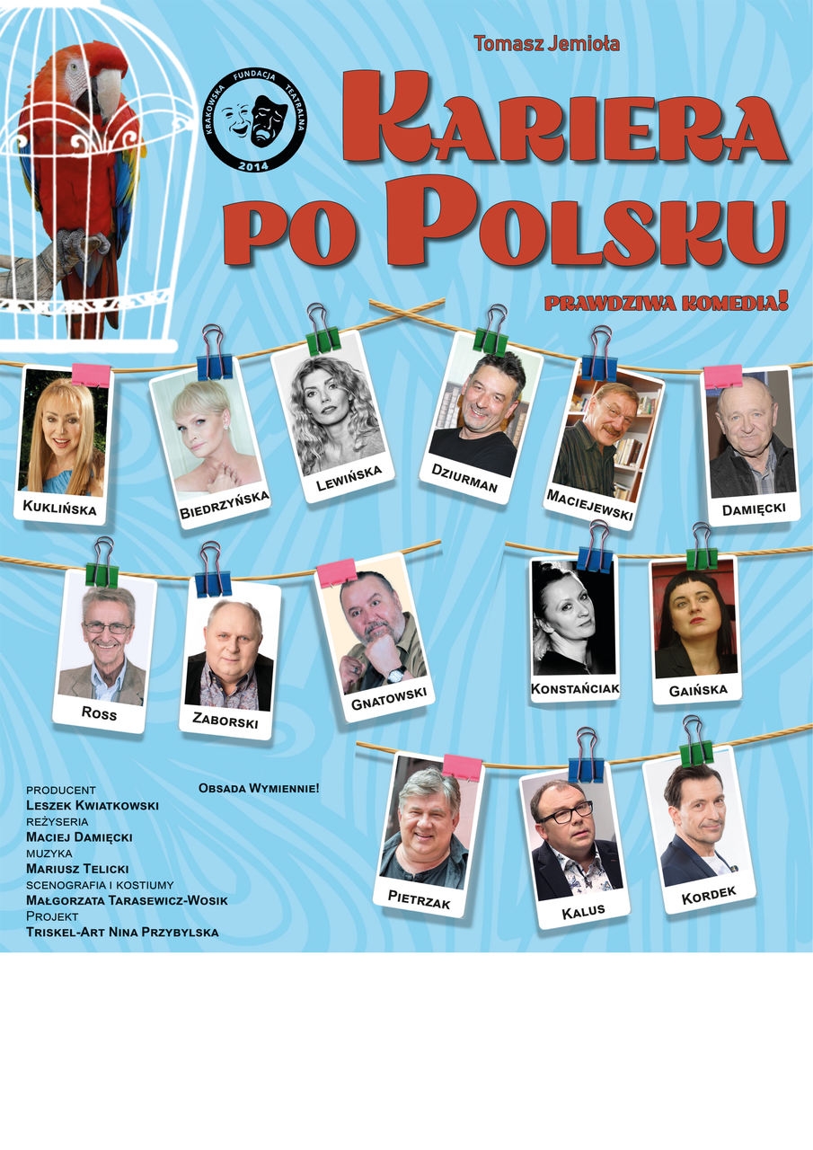 KARIERA PO POLSKU, to sztuka o żebrakach, którzy nieoczekiwanie dla siebie robią urzędniczą „karierę”. Zostają wprowadzeni w świat establishmentu małego miasteczka przez żonę pyszałkowatego burmistrza, który ją zdradza, jest zajęty własną karierą i zbyt mało się nią interesuje. Żona, żeby się na nim zemścić, postanawia mu dowieść, że w dzisiejszych czasach aby zostać wysokim urzędnikiem, nie trzeba wiele umieć. Postanawia poszukać odpowiedniego kandydata wśród żebraków. W tym celu przebiera się za żebraczkę i wchodzi w ich środowisko. Żebracy, ponieważ jeden z nich chciał być kiedyś aktorem, chcą założyć teatrzyk uliczny i próbują nieudolnie zagrać fragment Wesela Wyspiańskiego. Pojawia się policjant, który uważa, że to jest zgromadzenie i usiłuje ich przywołać do porządku. Burmistrz chcąc wygrać zbliżające się wybory, odwiedza mieszkańców miasteczka i napotyka żebraków i swoją żonę, której nie rozpoznaje i „nadaje” na nią. Żona coraz bardziej wściekła, rozdziela wśród żebraków role, które mają zagrać przed burmistrzem i wtajemnicza ich w cały plan. Jeden żebrak ma udawać eksperta od ekonomii, drugi mecenasa, specjalistę w dziedzinie prawa miejskiego. Następuje spotkanie z burmistrzem, podczas którego burmistrz zaczyna wierzyć, że ma do czynienia z prawdziwymi fachowcami. W tak zwanym między czasie żona burmistrza zawiadamia Ministerstwo Gospodarki, że w małym miasteczku pojawił się geniusz ekonomii, który z pewnością przyda się w Ministerstwie. Do miasteczka przyjeżdża zainteresowany geniuszem, sam minister gospodarki i wręcza żebrakowi nominację na stanowisko swojego doradcy. Od tej chwili z żebrakiem, jako wysokiej klasy ekspertem od ekonomii, wszyscy muszą się liczyć. Jak by tego było mało, żona burmistrza zakochuje się w żebraku, który robi taką karierę i postanawia rozwieść się z mężem, który teraz w jej oczach, już niewiele znaczy. Ale na końcu następuje nieoczekiwany zwrot akcji, który misternie ułożony plan, wywraca do góry nogami. Wszystko bowiem okazuje się mistyfikacją. Widz w pewnym momencie zrozumie, że został wciągnięty przez aktorów w grę, w którą sam uwierzył. W przedstawieniu niebagatelną rolę odgrywa również papuga, która co chwila we wszystko się wtrąca, stając się mimo woli centralną postacią sztuki.