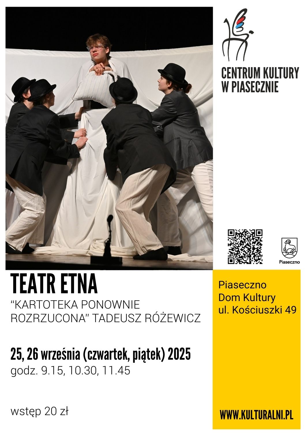 Opis zespołu: Teatr Etna to grupa reprezentacyjna Centrum Kultury w Piasecznie mająca swoją genezę w powstałym ponad 30 lat temu teatrze Nic Pewnego. Skupia ludzi dla których teatr jest nie tylko pasją, ale sposobem na życie, spędzanie wolnego czasu i wyrażanie siebie. Zespół ma na koncie kilkaset nagród i wyróżnień na festiwalach w Polsce i zagranicą.