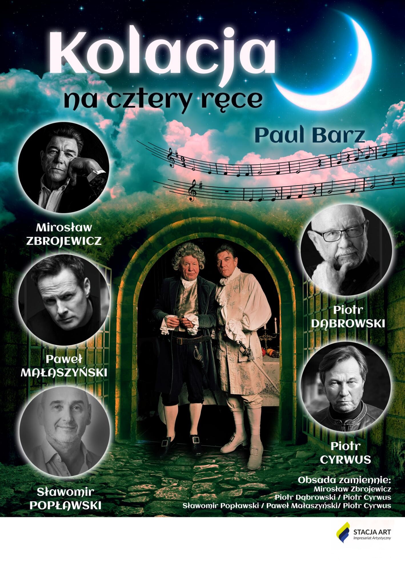 Hotel Turyński w Lipsku. Jest rok 1747, przy jednym stole zasiadają wybitni kompozytorzy: Jerzy Fryderyk Haendel oraz Jan Sebastian Bach…Historia, która się nie wydarzyła, ale w teatrze wszystko jest możliwe, dlatego na premierę spektaklu „Kolacja na cztery ręce” Paula Barza. Paul Barz to niemiecki pisarz, muzykolog i dziennikarz, zyskał sławę właśnie dzięki tej sztuce, która, przetłumaczona na czternaście języków, wędruje po scenach całego świata.