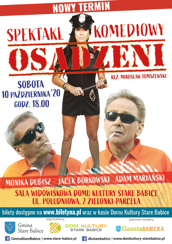 Bilety na komedię dostępne na www.biletyna.pl lub w kasie Domu Kultury Stare Babice. Dla posiadaczy Karty Dużej Rodziny wydanej w Gminie Stare Babice (numer karty KDR zaczynający się od następujących cyfr 1432072) oraz posiadaczy Ogólnopolskiej Karty Seniora wydanej w Gminie Stare Babice bilety ze zniżką 20 % tj. 32 zł. Bilety ze zniżką do kupienia wyłącznie w kasie Domu Kultury Stare Babice przy ul. Południowej 2a w Zielonkach-Parceli po okazaniu Karty Dużej Rodziny lub Karty Seniora. Płatność kartą. Kasa czynna pn-pt. godz. 8:00-16:00.