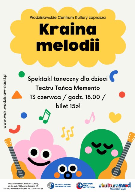 Wodzisławskie Centrum Kultury zaprasza na spektakl dla dzieci pt. „Kraina melodii” w wykonaniu małych aktorów z Teatru Tańca Memento. Przedstawienie zostało zaplanowane na 13 czerwca, w niedzielę na godz. 18:00.