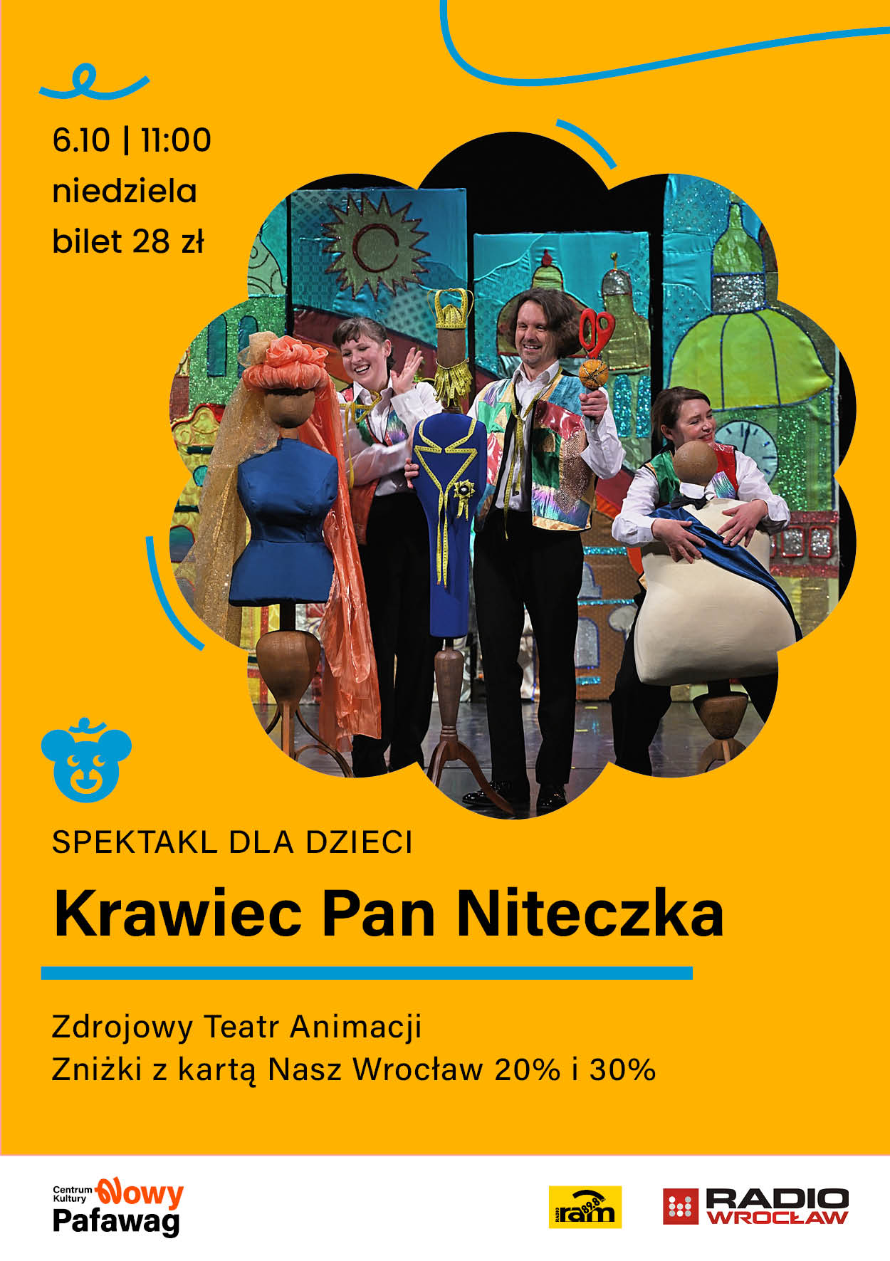 Niezwykle wesołe, pogodne i rozśpiewane przedstawienie stworzone z myślą o dzieciach w wieku przedszkolnym i wczesnoszkolnym. Spektakl pokazuje, w jaki sposób można stworzyć teatr z przedmiotów i rzeczy, z którymi mamy do czynienia na co dzień: buty, żelazko, kubek, nożyczki etc. Dzieci mają bogatą wyobraźnię, a my dajemy szansę do jej rozwoju. Doświadczymy „teatru w teatrze” włączając dziecięcą widownię do magicznego świata spektaklu, w którym nasi aktorzy pokażą jak szyją bajki jako pracownicy zakładu krawieckiego. Spektakl oparty na klasycznym opowiadaniu Kornela Makuszyńskiego wzbogacony interakcją z odbiorcami sztuki z nutką improwizacji.
