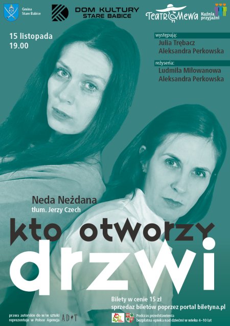 Bilety na spektakl dostępne są na www.biletyna.pl lub w kasie Domu Kultury Stare Babice. Dla posiadaczy Karty Dużej Rodziny wydanej w Gminie Stare Babice (numer karty KDR zaczynający się od następujących cyfr 1432072) oraz posiadaczy Ogólnopolskiej Karty Seniora wydanej w Gminie Stare Babice bilety ze zniżką 20 % tj. 12 zł. Bilety ze zniżką do kupienia wyłącznie w kasie Domu Kultury Stare Babice przy ul. Południowej 2a w Zielonkach-Parceli po okazaniu Karty Dużej Rodziny lub Karty Seniora. Płatność kartą. Kasa czynna pn-pt. godz. 8:00-16:00.