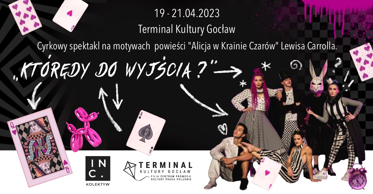 Gramy 20 i 21.04.2023 o 11:00 oraz 21.04.2023 o 19:00… a przynajmniej tak mówi Biały Królik, a ponieważ on jako jedyny używa zegarka, może mieć rację… w Terminalu Kultury Gocław! A stamtąd prościutko, przez Króliczą Norę, do…Krainy Czarów.