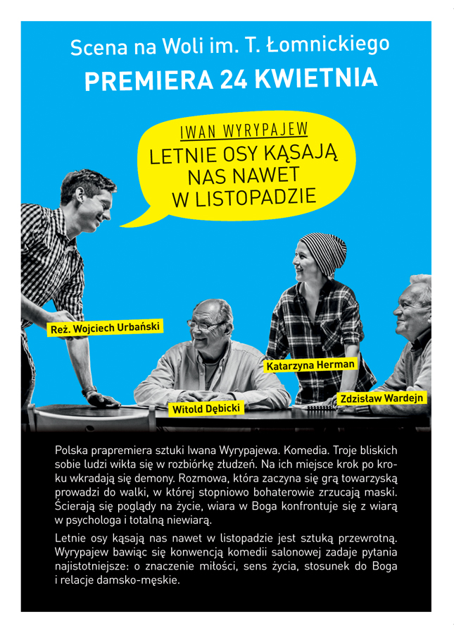 Letnie osy kąsają nas nawet w listopadzie jest sztuką przewrotną. Wyrypajew bawiąc się konwencją komedii salonowej zadaje pytania najistotniejsze: o znaczenie miłości, sens życia, stosunek do Boga i relacje damsko-męskie.