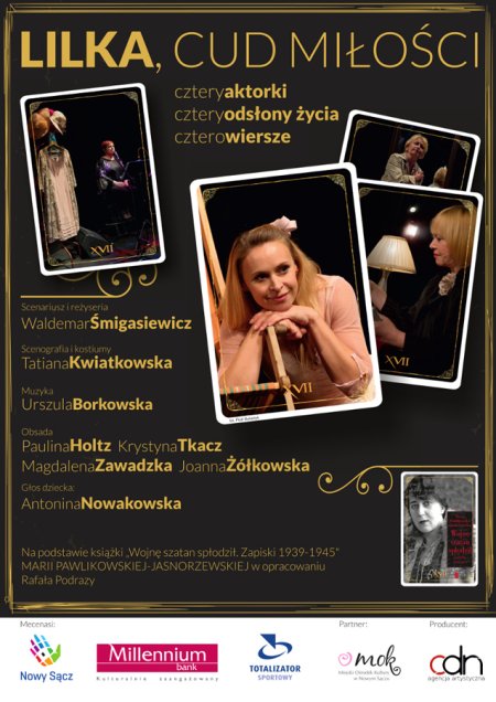 Całość wyczarowują dla widza cztery wspaniałe aktorki: Magdalena Zawadzka - jako Lilka - przewodniczka po tym, stworzonym przez reżysera Waldemara Śmigasiewicza, świecie, Afrodyta Weselak - młoda aktorka Teatru Polskiego w Warszawie, która pokazała bardzo dojrzałe aktorstwo i stworzyła wyrazistą postać Lilki od naiwnego, arkadyjskiego dzieciństwa po rozgoryczoną życiem kobietę, Joanna Żółkowska - jako Lilka Samotna - analizująca swe życie jak partię tarota i Krystyna Tkacz - Lilka Śpiewająca - ale jak! Aktorka śpiewa bowiem wiersze poetki z nowoczesną, dynamiczną, różnorodną i wspaniale wypełniającą te wiersze muzyką Urszuli Borkowskiej z sobie tylko właściwymi: charyzmą, energią i kulturą muzyczną.