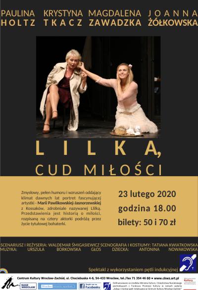„LILKA, CUD MIŁOŚCI” to zmysłowy, pełen humoru i wzruszeń, oddający klimat dawnych lat portret fascynującej artystki – Marii Pawlikowskiej-Jasnorzewskiej z Kossaków, zdrobniale nazywanej Lilką. W spektaklu grają znakomite aktorki: PAULINA HOLTZ, KRYSTYNA TKACZ, MAGDALENA ZAWADZKA, JOANNA ŻÓŁKOWSKA.
