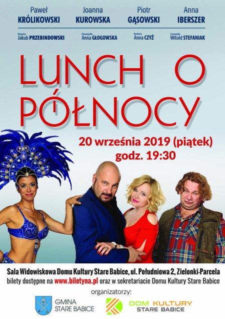 Bohaterami sztuki „Lunch o północy” są Roman i Barbara, małżonkowie z wieloletnim stażem. Roman przeżywa kryzys wieku średniego, marzy o urozmaiceniu swojego życia erotycznego, nie chce jednak zdradzać żony. Dlatego w 16. rocznicę ślubu przygotowuje dla niej wyjątkową niespodziankę. Zaprasza do domu poznaną przez internet parę, aby urządzić frywolną imprezę. Do domu trafiają jednak zupełnie przypadkowi ludzie. Omyłkowe spotkanie staje się pretekstem do opowieści o małżeńskich związkach, miłości, seksie i marzeniach, głęboko skrywanych w naszej podświadomości. Sztuka Jakuba Przebindowskiego to próba przyjrzenia się temu, co nas bawi i intryguje.