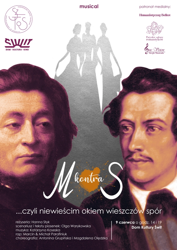 Nie znaliście Wieszczów od tej strony! Kto sfriendzonował Mickiewicza? Co, oprócz talentu, łączyło Słowackiego z Chopinem? Ile muz w życiu poety to przesada? Na wszystkie te pytania odpowiemy wierszem i piosenką w autorskim spektaklu muzycznym „M. kontra S.” , który - podobnie jak słynny “Hamilton” - przedstawi znane postaci historyczne w nowatorskiej, musicalowej odsłonie, i - tak jak „SIX” - odda mikrofon kobietom.