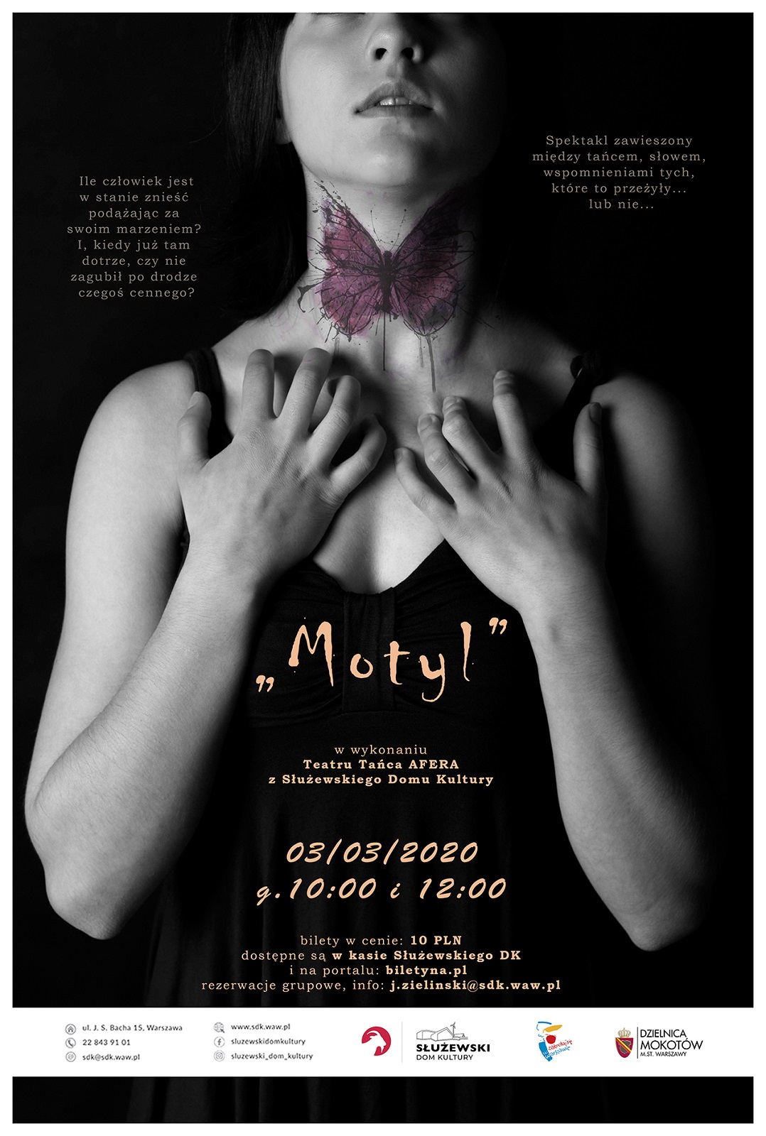 Zapraszamy na spektakl, pt."MOTYL” opowiadający o reżimie panującym w szkole baletowej, poświęceniu w drodze do realizowania pasji i spełniania swoich marzeń, przygotowany przez młodzieżowy Teatr Tańca AFERA w Służewskim Domu Kultury.