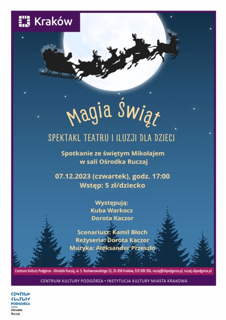 Zapraszamy wszystkie dzieci w niesamowitą podróż do świata teatru i iluzji! Zobaczycie prawdziwego magika i sztuczki, które sprawią, że uwierzycie w magię! Będziecie mieli okazję zobaczyć, jak przedmioty znikają, pojawiają się i zmieniają swoje miejsce. Usłyszycie niesamowitą historię świąteczną, która rozbawi was i wzruszy do łez! Czy święty Mikołaj zdąży? Czy czas świąteczny to coś więcej niż tylko prezenty? Czy dzieci dadzą radę pomóc św. Mikołajowi? I czy magia świąt istnieje?! Tego i jeszcze więcej dowiecie się już niedługo! Zapraszamy całymi rodzinami.