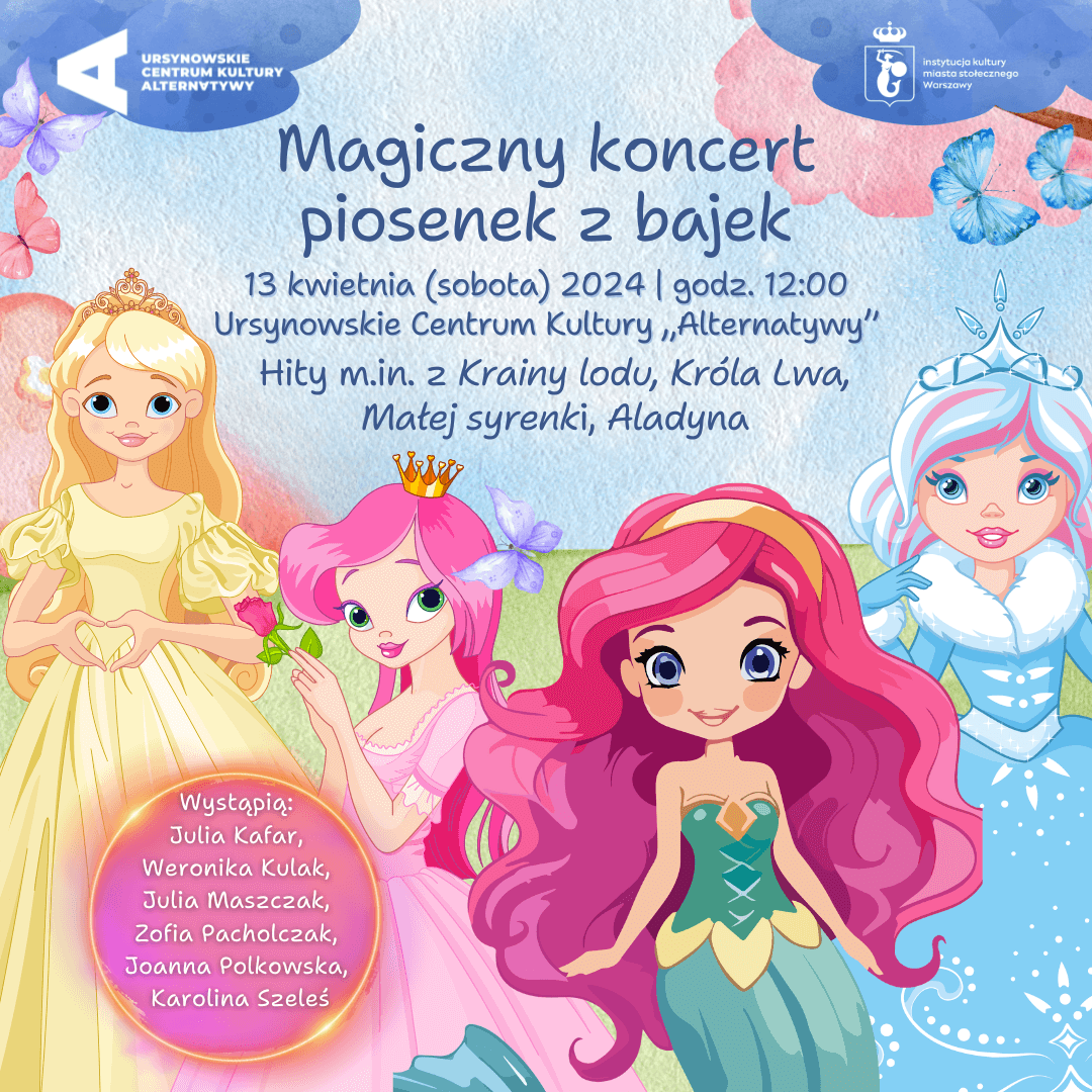 Podczas koncertu poznamy fascynujący świat znanych i kochanych postaci z najbardziej popularnych filmów animowanych Disneya! W trakcie tej baśniowej przygody na scenie pojawią się księżniczki, które opowiedzą małym widzom swoje historie. Artystki – Julia Kafar, Julia Kulak, Julia Maszczak, Zofia Pacholczak, Joanna Polkowska i Karolna Szeleś – zaśpiewają największe hity z Krainy lodu, Króla Lwa, Małej syrenki czy Aladyna. Wydarzenie nie tylko dostarczy rozrywki, ale także rozbudzi dziecięcą wyobraźnię, rozwijając w młodych słuchaczach miłość do muzyki i kultury. To będzie doskonałe artystyczne przyjęcie, na którym nie zabraknie konkursów z nagrodami!