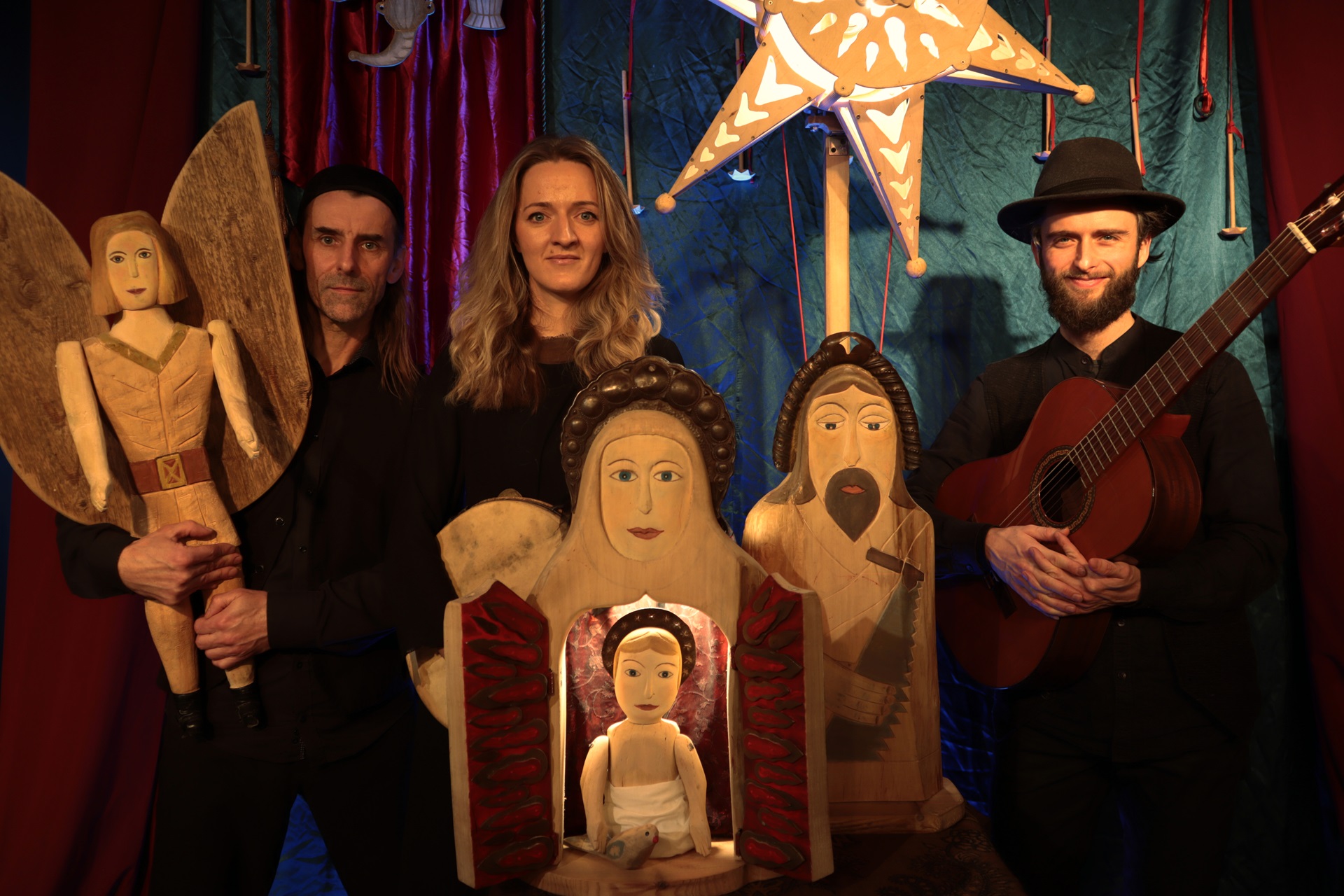 Dzieci będą miały okazję zapoznać się z dawną formą teatru, opartą o animację rzeźbami, wykonanymi z drewna przez aktora i reżysera Piotra Rogalińskiego. Piękne, ręcznie malowane figury wprowadzą nas w kolejne sceny z Aniołem, Maryją, Józefem i ich wędrówką do Betlejem.