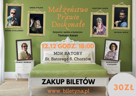 "Małżeństwo prawie doskonałe" to klasyczna farsa opowiadająca o perypetiach miłosnych małżeństwa z 20 letnim stażem. Widz będzie miał okazję spojrzeć na skomplikowany świat relacji damsko-męskich widzianych z perspektywy różnorodnych, często ekscentrycznych postaci. Spektakl stanowi finał warsztatów aktorskich prowadzonych w Klaps Film Studio w Chorzowie.