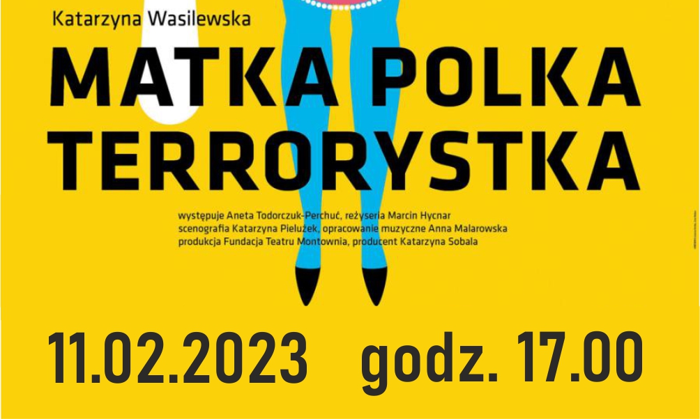 Nowodworski Ośrodek Kultury zaprasza naniezwykły monodram w wykonaniu Anety Todorczuk-Perchuć: aktorki teatralnej, filmowej i telewizyjnej. Sztukę „MATKA POLKA ,TERORYSTKA” napisała Katarzyna Wasilewska – pisarka, psycholożka, dziennikarka, wielbicielki historii z życia wziętych, a wyreżyserował ją Marcin Hycnar – aktor Teatru Narodowego. Monodram grany był w Teatrze Polonia.