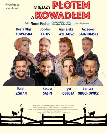 Niedaleko pada jabłko od jabłoni, Wina ojca idzie w syna, Jaki ojciec, taki syn... Wszystkie te polskie mądrości mieszczą się w kanadyjskiej komedii Norma Fostera Między płotem a kowadłem (Mending fences). Harry, właściciel gospodarstwa na dalekiej prowincji, nie widział swojego syna, Drew, szesnaście lat. Przyjeżdża on właśnie do ojca z wizytą. Ta wzruszająca komedia opowiada historię dwóch mężczyzn, syna i ojca, którzy są zbyt uparci na to, żeby otworzyć swoje serca jeden na drugiego. Nie radzą sobie z okazywaniem uczuć. Rozdzieleni na lata, dziś jako dorośli mężczyźni, stają wobec siebie zupełnie bezradni, czupurni, przytłoczeni emocjami i oślim uporem, do których wstydzą się przyznać. Tworzy to mnóstwo zabawnych sytuacji. Dyskretnym przewodnikiem po obcym im świecie uczuć jest „kobieta po przejściach”, przyjaciółka i partnerka ojca, która jest właścicielką sąsiedniego gospodarstwa. Czy uda się jej pogodzić ogień z wodą, psa z kotem…? Gęste nasycenie zabawnych dialogów i sytuacji, okraszone często pikanterią, a jednocześnie z elementami ciepła i liryzmu. Ot, jak to życie. Świetna gra aktorów. To świeży oddech w świecie sztuki zdominowanym przez sensację i farsę. Norm Foster znany jest od wielu lat polskiemu widzowi z takich sztuk jak: Ostra jazda, Premiera, Między łóżkami, Old Love, Długi ŁYKend, Randka w ciemno na dwie pary, Przygoda z ogrodnikiem… i kilku innych.