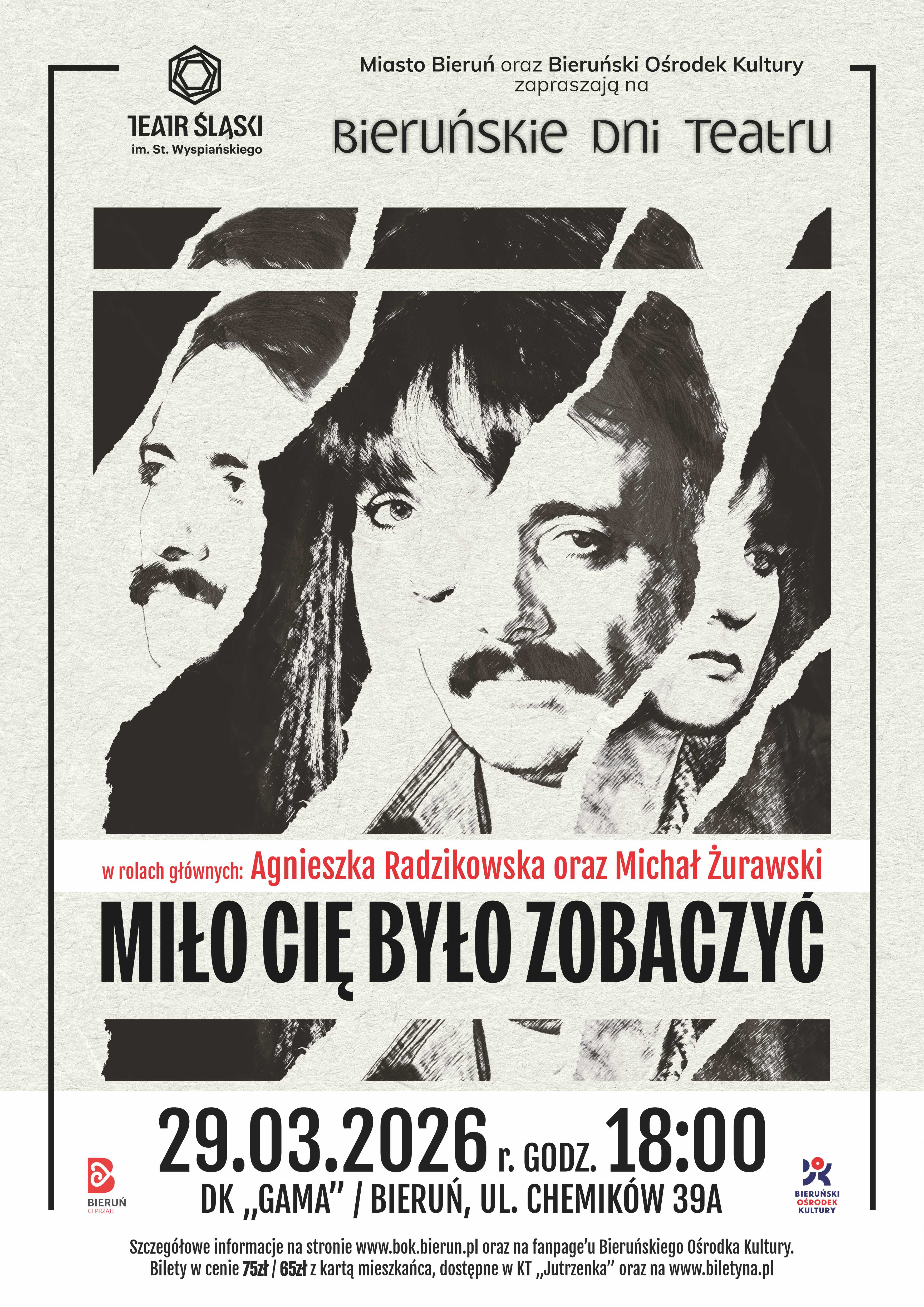 "Miło cię było zobaczyć" reżyseruje Stanisław Chludziński, artysta młodego pokolenia. Do świata miłości sprzed lat przeniosą Was Agnieszka Radzikowska i Michał Żurawski - niezapomniana aktorska para z filmu "Strzępy" w reżyserii Beaty Dzianowicz, znani także z głośnego w ostatnim czasie serialu "Heweliusz". Miło ich będzie zobaczyć razem na scenie Domu kultury "Gama"!