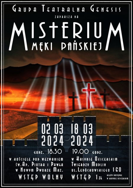 Parafia Św. Ap. Piotra i Pawła w Nowym Dworze Mazowieckim, Burmistrz Miasta Nowy Dwór Mazowiecki Jacek Kowalski oraz Nowodworski Ośrodek Kultury zapraszają na spektakl Grupy Teatralnej Genesis "Misterium Męki Pańskiej"