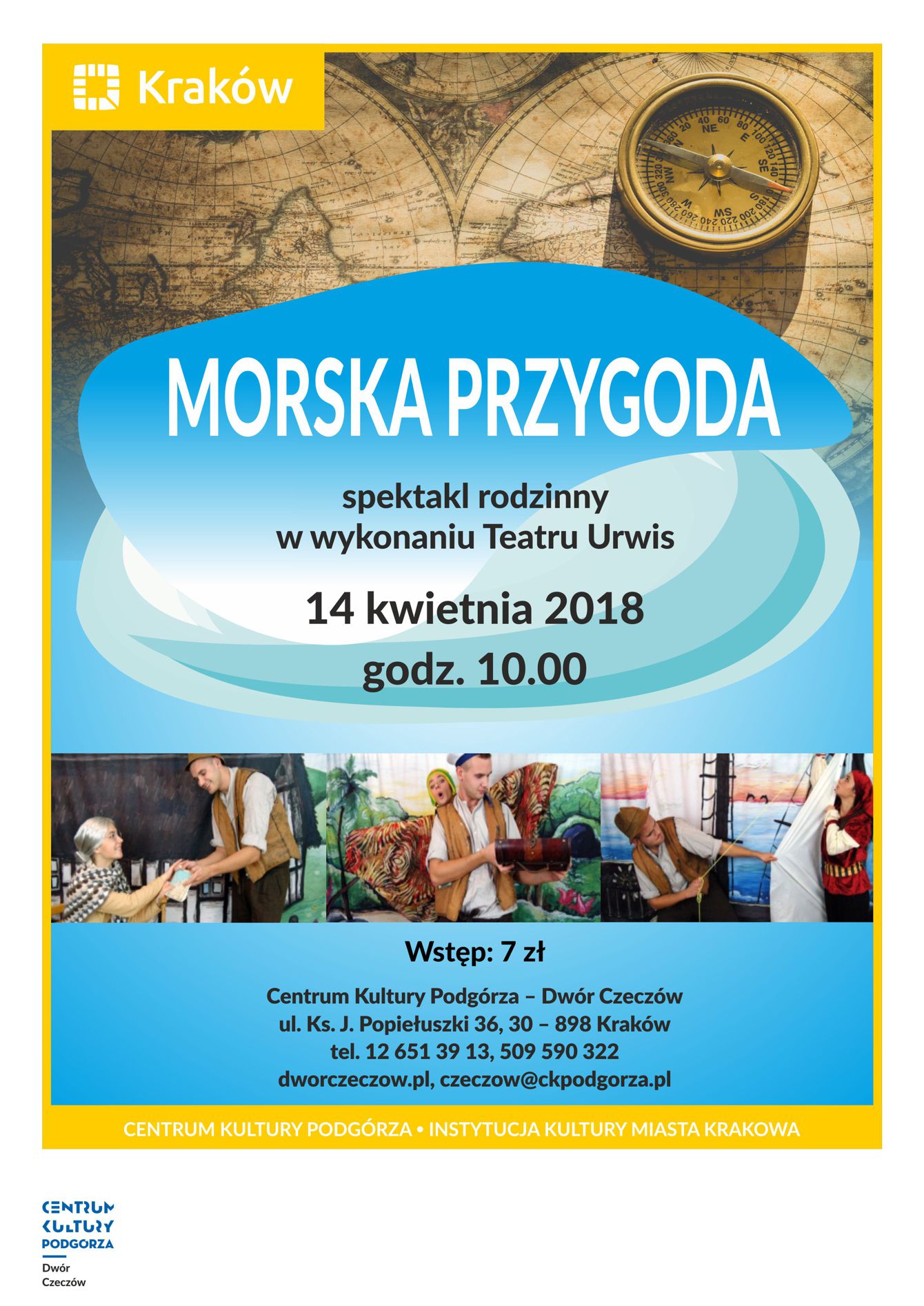 Zapraszamy na kwietniowy spektakl rodzinny pt."Morska Przygoda" w wykonaniu Teatr Urwis. Spektakl odbędzie się 14 kwietnia o godzinie 10:00 w CKP Dwór Czeczów.
