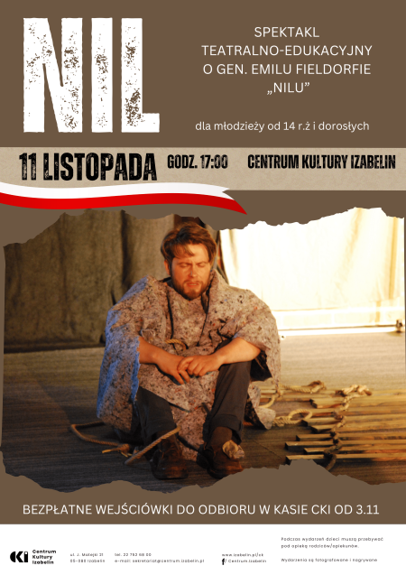Zapraszamy na wyjątkowy spektakl teatralno-edukacyjny pt. „Nil” o gen. Emilu Fieldorfie „Nilu”. Twórcy pokazują ważne momenty biografii generała podczas wojny i po niej. Bohater, w którego wciela się aktor Krzysztof Stanio, opowiada o ostatnich chwilach z rodziną przed wybuchem wojny, swojej misji emisariusza z Londynu do kraju, organizowaniu Kierownictwa Dywersji, pobycie w łagrach w ZSRR oraz aresztowaniu i wyroku śmierci w komunistycznej Polsce. Scenarzysta i reżyser Jarosław Tochowicz przybliża historyczny kontekst przedstawionych wydarzeń.