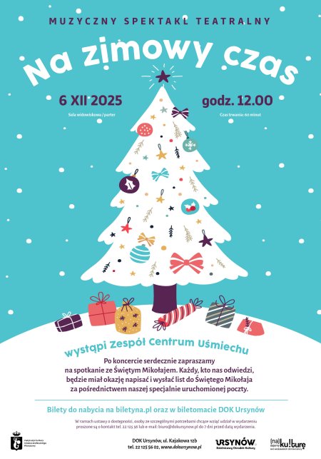 Zapraszamy na wyjątkowy, pełen magii muzyczny spektakl świąteczny „Na zimowy czas” w wykonaniu Zespołu Centrum Uśmiechu – autorów przebojów takich jak „Olimpiada w Jarzynowie”, „Gruszka” czy „Światła drogowe”. Artyści, nominowani w 2023 roku do najważniejszej polskiej nagrody muzycznej – Fryderyk, przygotowali 60-minutowy koncert pełen radości, energii i zimowego nastroju.