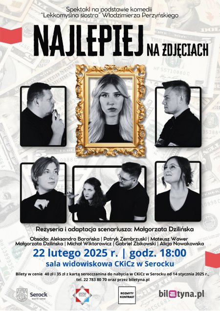 „Najlepiej na zdjęciach” to współczesna adaptacja komedii „Lekkomyślna siostra” Włodzimierza Perzyńskiego wydanej w roku 1904 w reżyserii Małgorzaty Dzilińskiej. Pomimo stu dwudziestu lat od premiery, naszym zdaniem tekst nie zestarzał się ani trochę. Małe miasteczko, a w nim zwykła rodzina z normalnymi, codziennymi problemami. Niestety, ten spokój zostaje zburzony przez nagły powrót rodzinnej „czarnej owcy”- Marii, która przed wieloma laty wyjechała do Londynu, aby szukać miłości i wolności, porzucając kochającego męża oraz małe dziecko. Obecność kobiety jest zdecydowanie nie na rękę dla większości członków rodziny Topolskich, ponieważ krążą plotki, że Maria za granicą prowadziła nie do końca przykładne i moralne życie. Chęć powrotu lekkomyślnej siostry do rodziny wywołuje oburzenie i skutkuje zmuszeniem jej do wyjazdu z kraju.