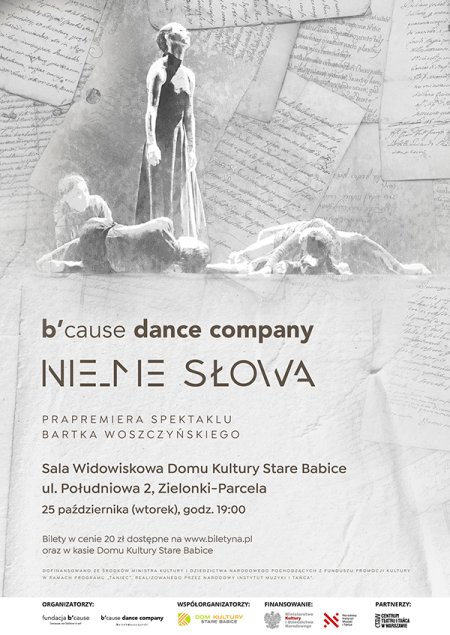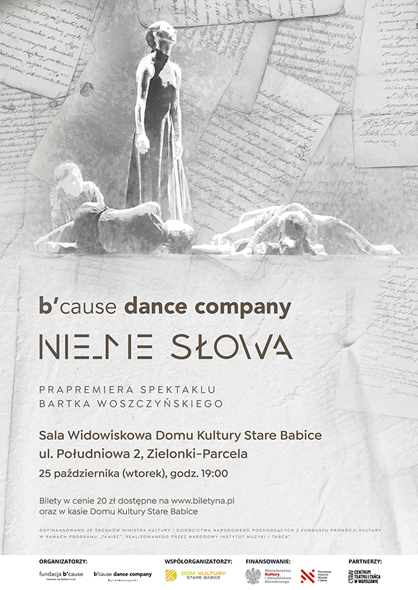 Zapraszamy serdecznie na premierę spektaklu „Nie_me słowa” w wykonaniu B'cause Dance Company, który odbędzie się 25 października (wtorek) o godz. 19:00 w Domu Kultury Stare Babice. Po spektaklu odbędzie się rozmowa z publicznością.