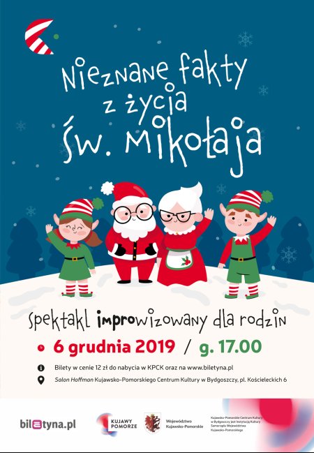 Wszyscy wiemy, że św. Mikołaj to bardzo pracowity człowiek i cały rok przygotowuje się do najważniejszych dni w roku. Jednak, jak każdemu z nas, i jemu zdarza się z pewnością wyjechać na wakacje do ciepłych krajów, pójść do kina czy też pokłócić z panią Mikołajową. Poruszymy wyobraźnię i stworzymy z małymi widzami nieznane sceny z życia mieszkańców Laponii, może któreś z naszych domysłów okaże się prawdą? Zapraszamy całe rodziny, wszak każdemu należy się w tym dniu godzina śmiechu. Cały spektakl jest w 100% improwizowany, występują improwizatorzy z grupy Bujdy i Bajania: Ada Żurawska, Jakub Dranicki i Cezary Markiewicz. Zapraszamy w Mikołajki, 6 grudnia 2019 o godz. 17.00 do Salonu Hoffman Kujawsko-Pomorskiego Centrum Kultury w Bydgoszczy.