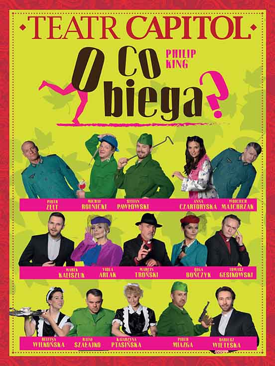 „O co biega?“ to jedna z najzabawniejszych światowych komedii autorstwa Philipa Kinga. Pełna zaskakujących zwrotów akcji historia, z minuty na minutę, choć wydaje się to już niemożliwe, staje się jeszcze śmieszniejsza. Do samego końca nie wiadomo, kto jeszcze pojawi się nagle w drzwiach lub niespodziewanie wyskoczy z szafy!