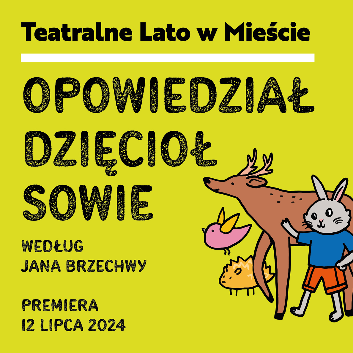Zapraszamy na premierę spektaklu: "Opowiedział Dzięcioł Sowie" wg. Jana Brzechwy w ramach Teatralnego Lata w Mieście. Będzie wspaniała zabawa i edukacja z morałem. Spektakl powstał wg ideii Teatru Dzieci dla Dzieci. i pokaz premierowy jest otwarty dla młodych widzów.
