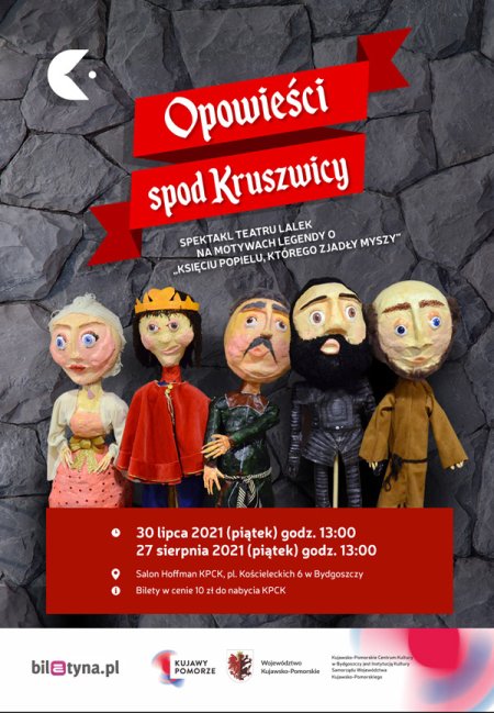 Kujawsko-Pomorskie Centrum Kultury zaprasza na autorski spektakl teatru lalek na motywach legendy o „Księciu Popielu, którego zjadły myszy”. Pouczająca historia Popiela i jego żony Gerdy zabierze nas w podróż do zamku w Kruszwicy.