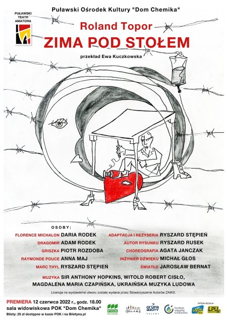 12 czerwca zapraszamy na najnowszą premierę w wykonaniu Puławskiego Teatru Amatora. „Zima pod stołem” to sztuka jednego z najwybitniejszych twórców ubiegłego wieku – Rolanda Topora – paryskiego pisarza/rysownika, w której mistrz surrealizmu i okrucieństwa zaskakuje z pozoru prostą komedią miłosną połączoną z dramatem.