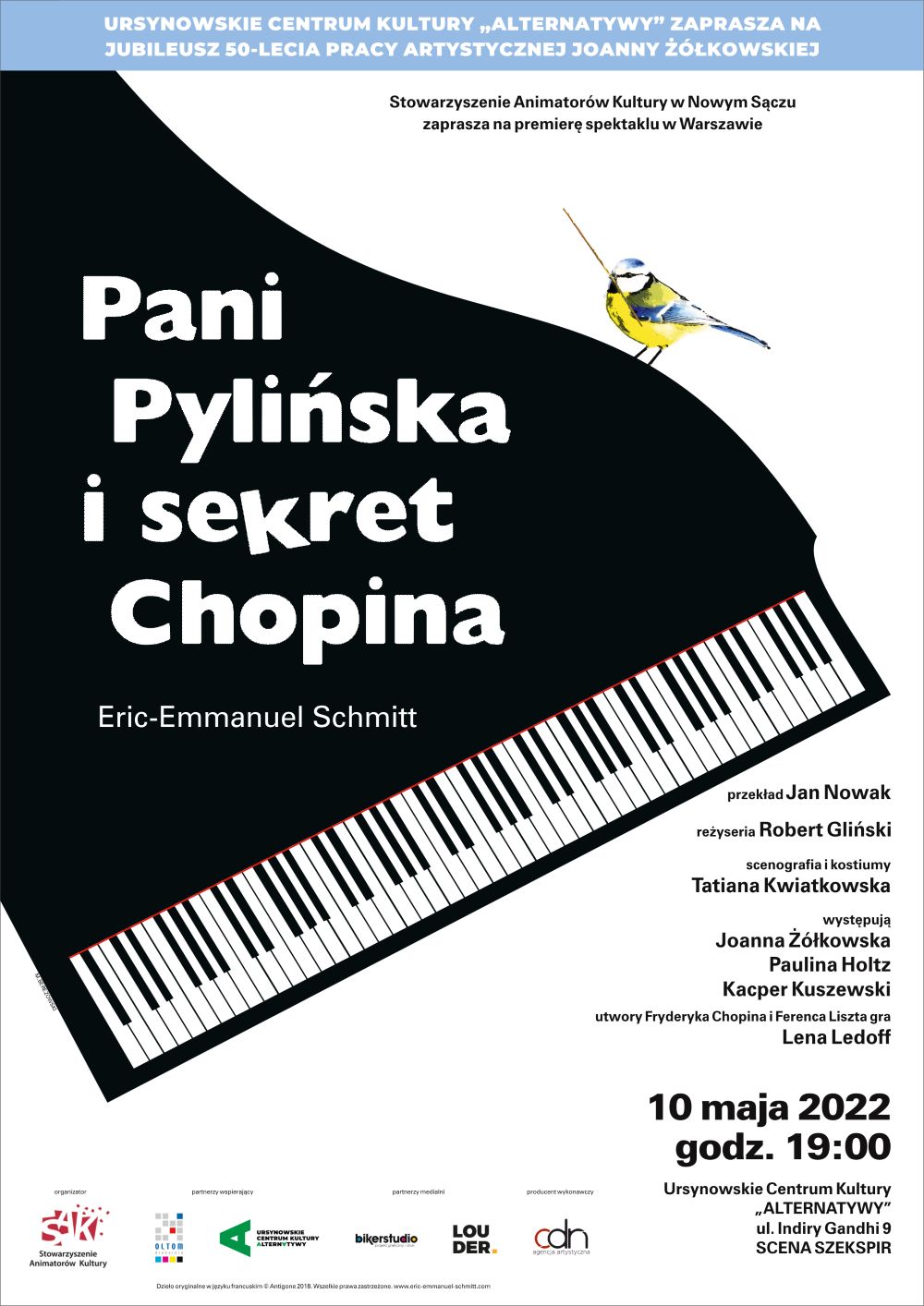 Z okazji jubileuszu 50-lecia pracy artystycznej Joanny Żółkowskiej zapraszamy na przedstawienie „Pani Pylińska i sekret Chopina” wg Érica-Emmanuela Schmitta w reżyserii Roberta Glińskiego. Spektaklem „Pani Pylińska i sekret Chopina” Joanna Żółkowska obchodzi 50-lecie pracy artystycznej.