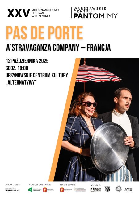 Madame żyje w świecie luksusu i elegancji, w przestronnym mieszkaniu z imponującym salonem, kryształowym serwisem do herbaty i wiernym lokajem, zawsze gotowym spełniać jej polecenia. Wydawałoby się, że niczego jej nie brakuje. A jednak! Madame się nudzi. Codzienność, choć wygodna, przytłacza ją i rodzi pragnienie ucieczki w przygodę. Problem w tym, że nie potrafi opuścić swojego komfortu. Wyrusza więc w świat… zabierając ze sobą służącego, serwis do herbaty, a nawet widok na własny salon! Spektakl „Pas de porte” to ekscentryczna, pełna wdzięku opowieść o potrzebie bezpieczeństwa, śmieszności naszych przyzwyczajeń i lęku przed nieznanym. W burleskowej, komediowej formie artyści prowadzą widza od śmiechu do refleksji, pokazując, że prawdziwą przygodę przeżywa się, zostawiając czasem coś za sobą.