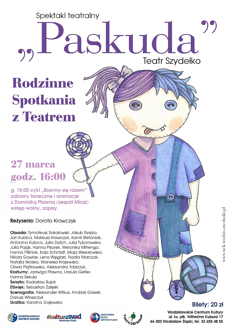 „Paskuda" – czyli spektakl w wykonaniu młodych aktorów Dziecięcego Teatru Szydełko, działającego w Wodzisławskim Centrum Kultury, to propozycja na spędzenie niedzielnego popołudnia w rodzinnym gronie. 27 marca o godz. 16:00 będzie miała miejsce kolejna edycja cyklu „Rodzinne spotkania z Teatrem", podczas której poznamy pełną wdzięku i uroku historię o codziennych zmaganiach dorastających dzieci.