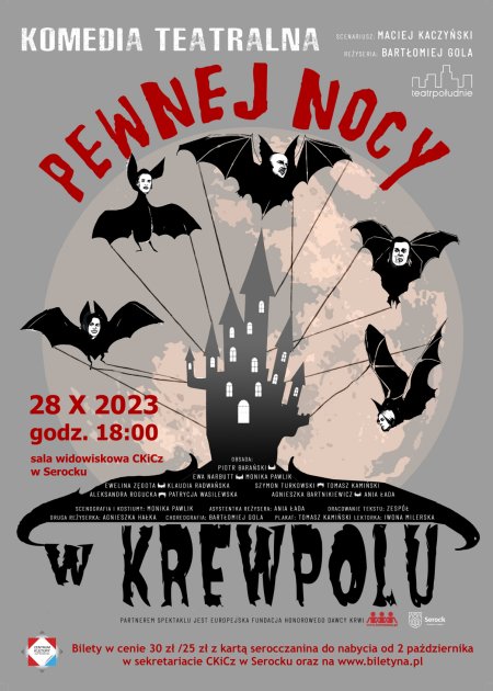 „Pewnej nocy w KREWPOLU” to komedia o wampirach i relacjach między-„ludzkich”, tych firmowych i prywatnych. Humor, momentami czarny i uniwersalność poruszanej tematyki, sprawiają, że jest to spektakl, który mogą obejrzeć zarówno fani świata wampirów jak i ci, którym te klimaty są raczej dalekie.