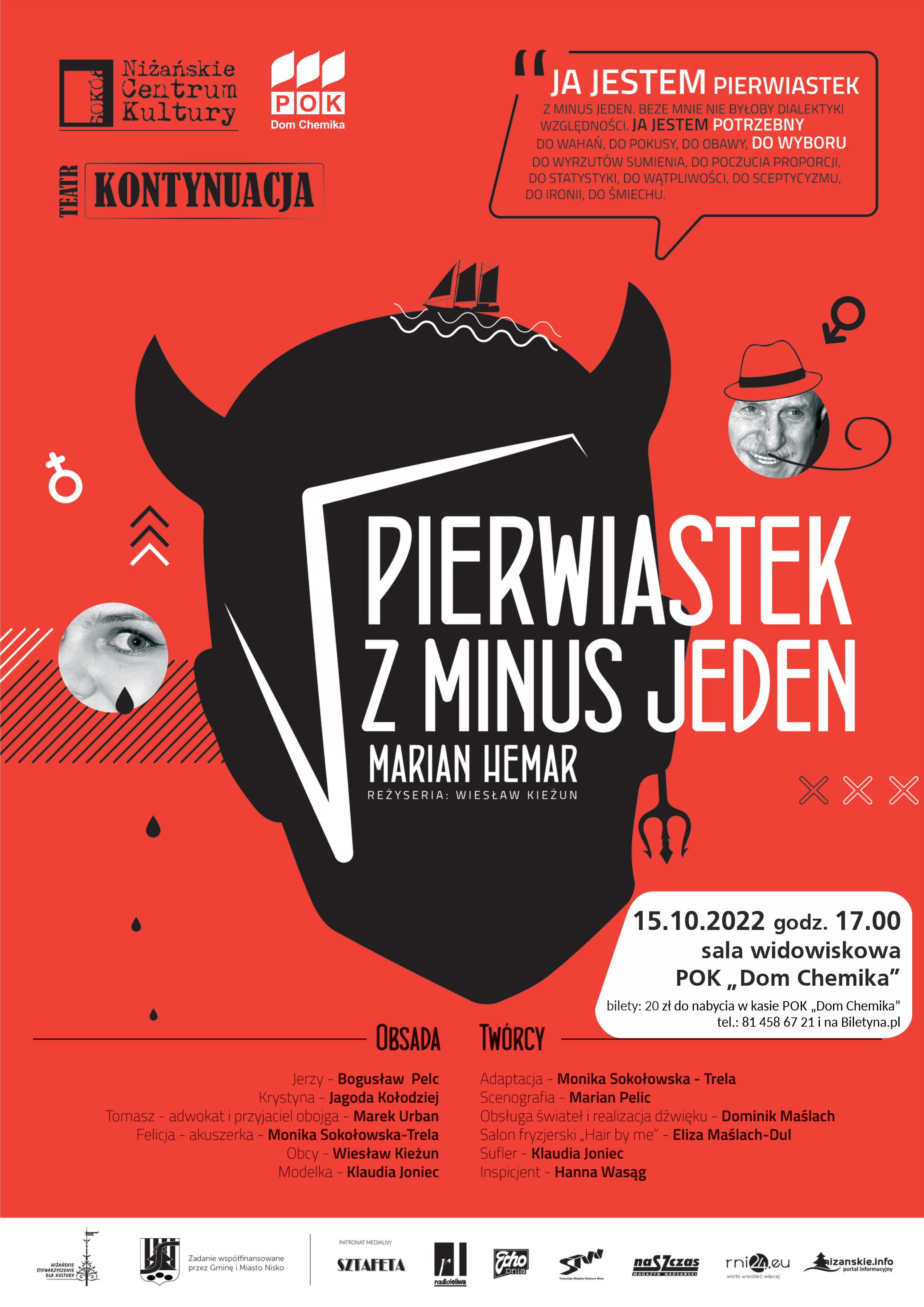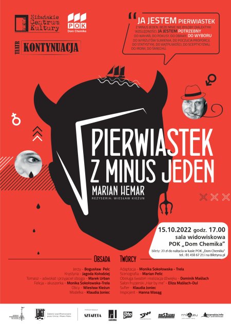 Na sztukę „Pierwiastek z minus jeden” zapraszamy 15 października 2022 r. o godz. 17.00 do sali widowiskowej POK "Dom Chemika". Bilety w cenie: 20 zł do nabycia w kasie POK, tel.: 81 458 67 21 i na Biletyna.pl.