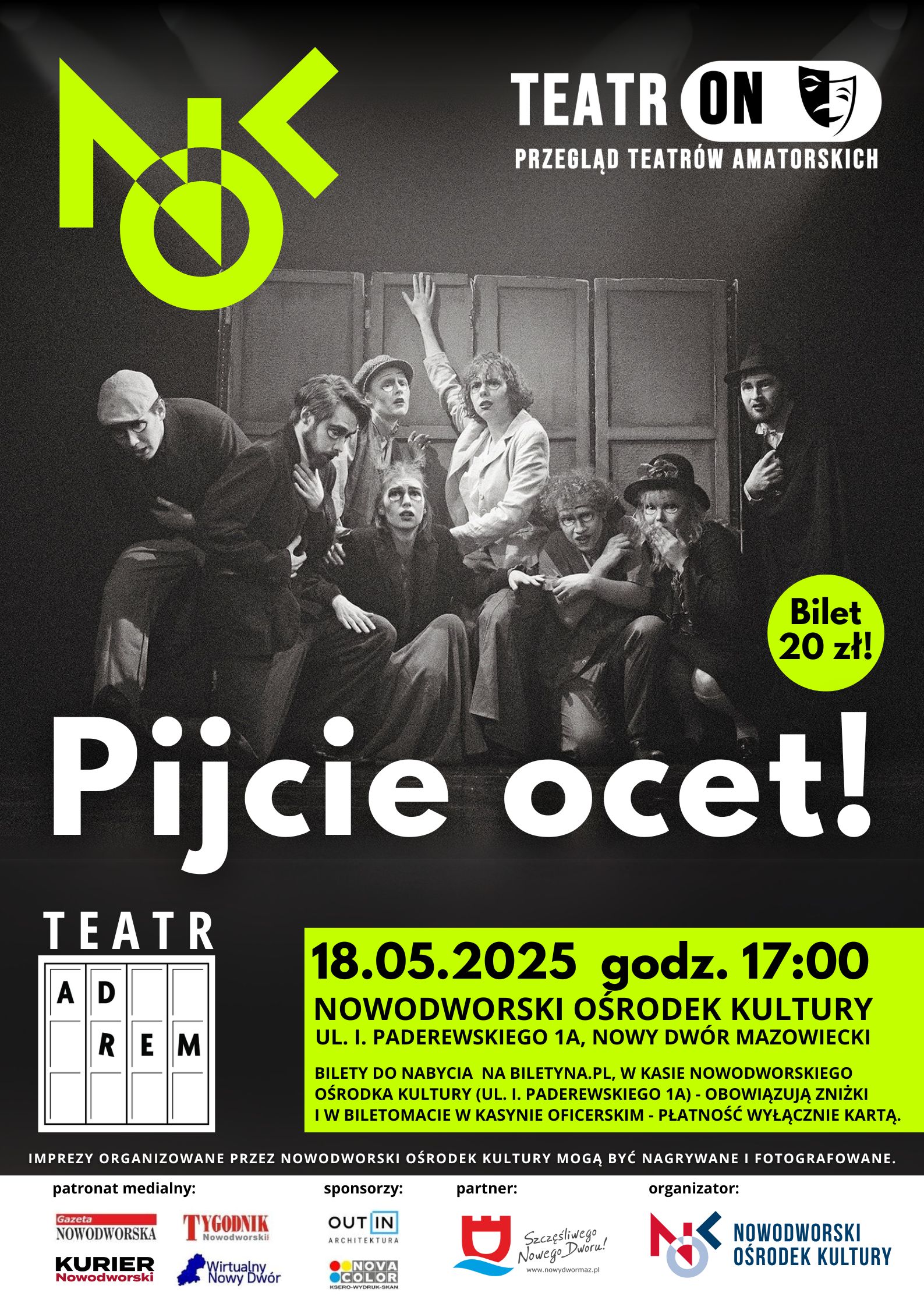 🎭W ramach Przeglądu Teatrów Amatorskich TeatrON zapraszamy na spektakl pt. "Pijcie ocet!" w wykonaniu teatru AD REM z Warszawy.