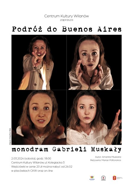 Przed nami trzecia edycja Wilanowskich Spotkań Teatralnych. Zaczynamy od zaproszenia Państwa na spotkanie z wybitną aktorką: Gabrielą Muskałą, która zabierze nas w metaforyczną podróż do Buenos Aires. Tak o spektaklu pisze Jacek Sieradzki, recenzent tygodnika „Polityka”: (…) W ponad godzinnym monologu Gabriela Muskała przedstawia proces rozsypywania się świadomości bohaterki, zamierania jej świata, stopniowej atrofii pamięci. Przedstawia przejmująco – właśnie dlatego, że niedosłownie, bez postarzania młodej twarzy i prowokowania zbyt łatwych wzruszeń… Cały ów work in regress (jak określono rzecz w podtytule) pokazany zachwycająco misternie i konsekwentnie; właśnie precyzja scenicznej relacji skupia uwagę widowni niczym kryminał. Mądry, dojrzały spektakl w reżyserii Mariana Półtoranosa...