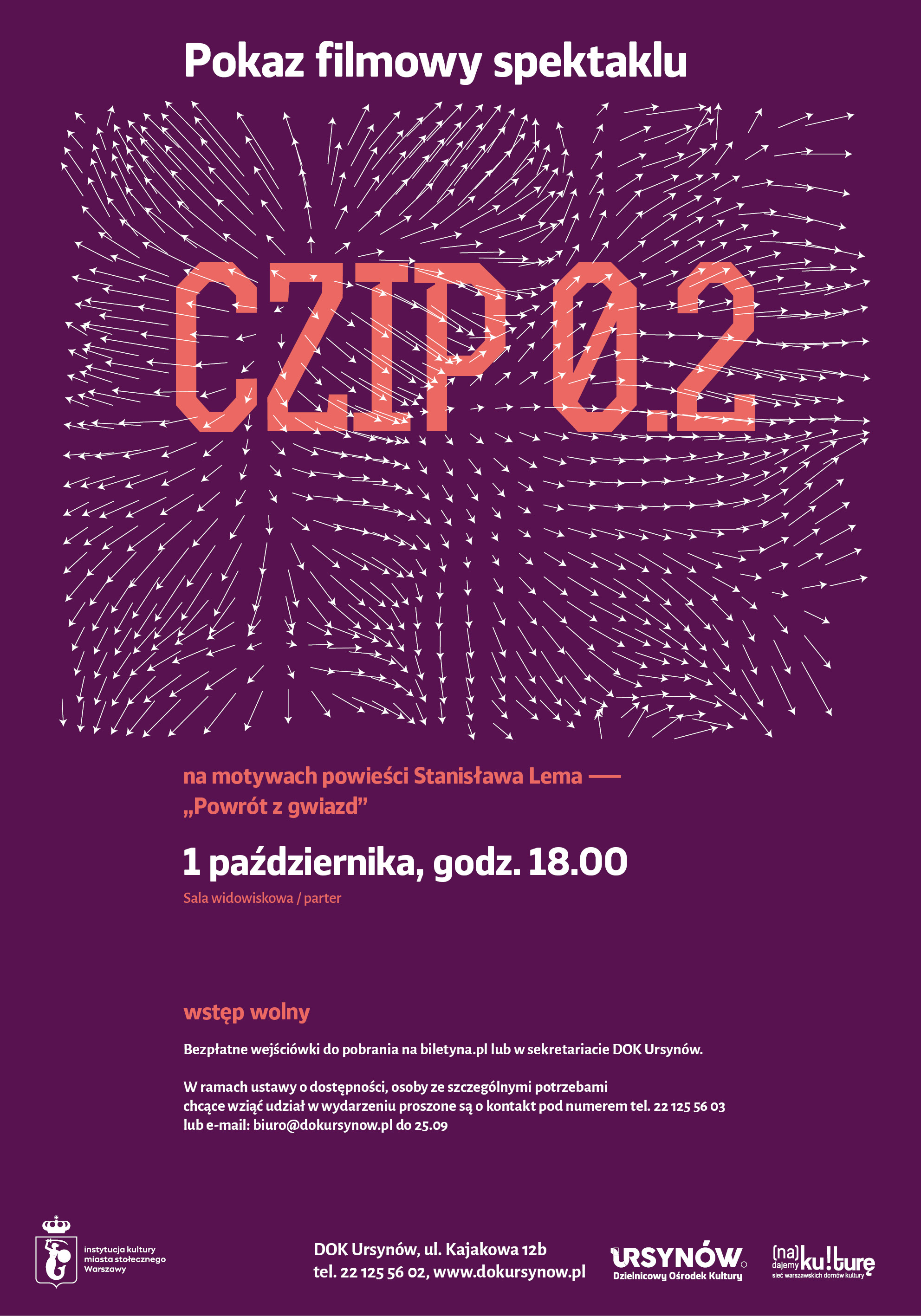 Pokaz filmowy spektaklu "CZIP 0.2", w wykonaniu Teatrów Scena 22 i Potok zarejestrowany w czerwcu w DOK-u. Spektakl w reżyserii i adaptacji prozy Stanisława Lema - Grzegorz Jach na podstawie scenariusza Agaty Pikoń.