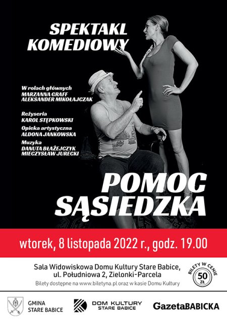 W komedii „Pomoc sąsiedzka” ten problem próbują rozwiązać sąsiedzi: Pani Jola i Pan Stefan, którzy mieszkając blisko siebie, funkcjonują w zupełnie innych kulturach, odrębnych światach. Pan Stefan jest „złotą rączką” a przy tym potrafi być wyjątkowo denerwujący. Pani Jola zaś to ekscentryczna pracoholiczka singielka, która uwielbia egzotyczne podróże. Sąsiadów różni chyba wszystko, a do tego każde z nich lubi mieć rację i lubi swoje życie, swoją wolność. Czy taka dwójka jest w stanie znaleźć choć cień porozumienia?