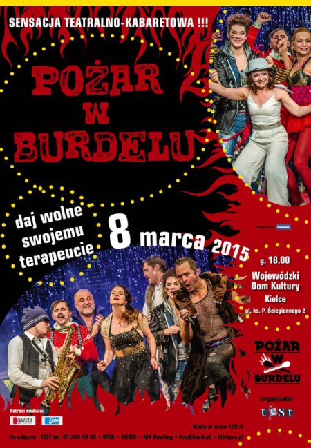 Pożar w burdelu to trupa teatralna- kabaretowa założona przez Michała Walczaka i Macieja Łubieńskiego w 2012 roku. Zespół tworzy kolejne przedstawienia w ramach cyklu, liczącego sobie już prawie dwadzieścia „odcinków” – spektakli. Każdy odcinek jest odrębną całością, zarazem stanowiąc jeden z rozdziałów losów stałych postaci, czyli specyficznych mieszkańców Warszawy. Bazyliszek, zamożni mieszkańcy strzeżonego osiedla, miejscy dziwacy, przedstawiciele władzy, terapeuta miasta i inni – wszyscy pod wodzą BurdelTaty kochają się, nienawidzą, zabijają, zmartwychwstają i przeżywają najdziksze przygody. Utalentowany zespół aktorski, muzyka na żywo, fajerwerki inteligentnego humoru i iskry erotycznego napięcia – całość kipi energią, żywiołowością i magią teatru. To trzeba zobaczyć, to trzeba przeżyć.