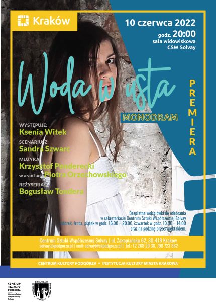 Woda w usta Premiera monodramu, który w niezwykle głęboki emocjonalnie sposób opowiada o problemach współczesności, utracie i opresji autorstwa Sandry Szwarc.