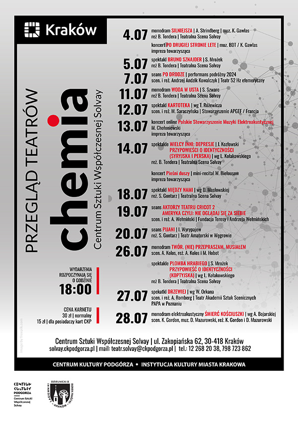 „chemia” to spotkania indywidualnych twórców i zespołów teatralnych z Polski i zagranicy. Złożą się na nie spektakle teatralne – w tym szczególna forma monodramu oraz koncerty i seanse filmowe.