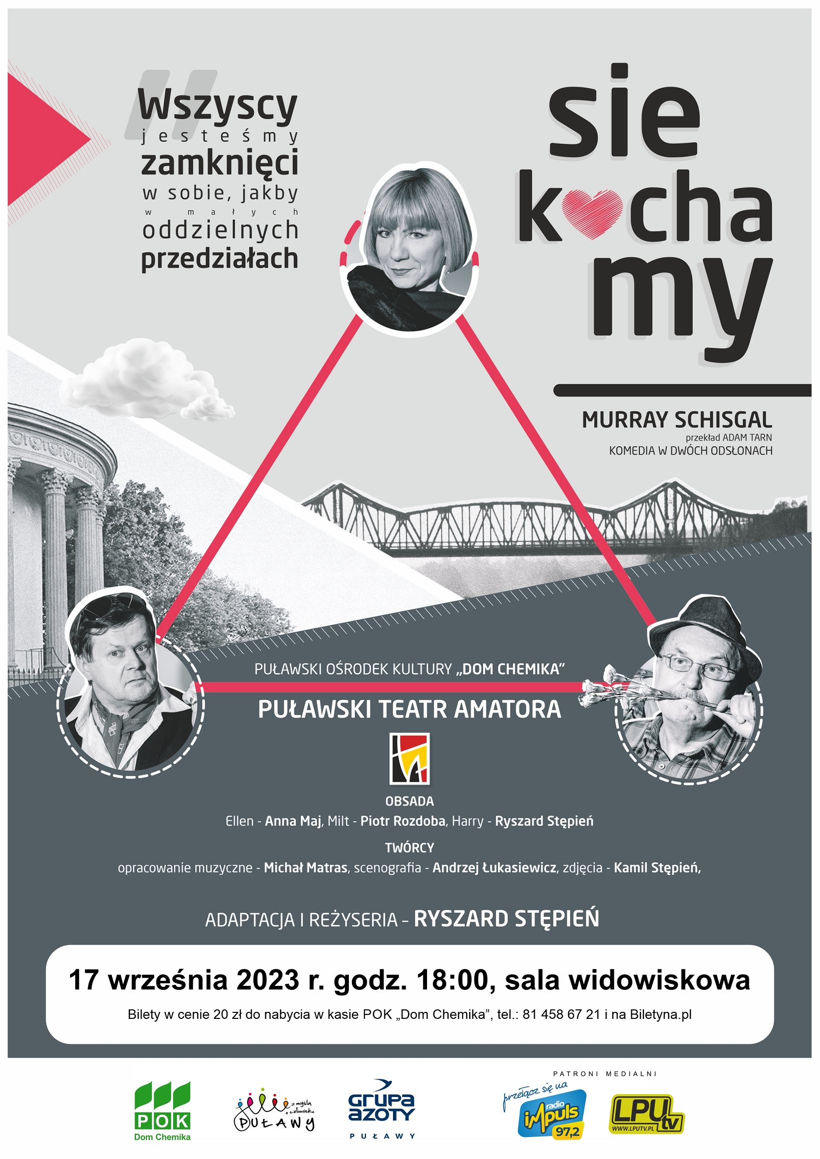 Spektakl „Się kochamy” autorstwa Murraya Schisgala to opowieść o klasycznym trójkącie miłosnym, w którym to mężczyźni knują zaskakującą w skutkach intrygę. Znakomita farsa o przewrotności ludzkiej natury, wspaniale napisane dialogi, humor rodem z najlepszych amerykańskich komedii filmowych – to wszystko znajdziecie w najnowszej premierze Puławskiego Teatru Amatora.
