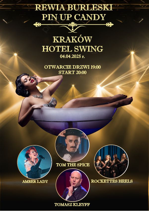 Przygotuj się na wieczór, który rozbudzi Twoje zmysły i rozpali wyobraźnię! Rewia Burleski by Pin Up Candy to widowisko pełne tajemnicy, elegancji i zmysłowości, w którym sztuka burleski splata się z ekstrawaganckim tańcem i muzyką. Tego wieczoru zobaczycie premierowe pokazy i show z gigantycznym kielichem szampana!