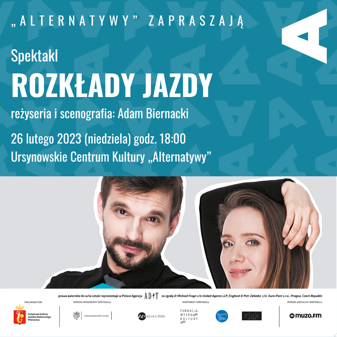 Czeski humor i angielska farsa, czyli teatralne spotkanie Petra Zelenki i Michaela Frayna. Brawurowy duet aktorski – Hanna Konarowska i Sebastian Cybulski – w spektaklu o życiu, o związkach i miłości. Dajcie się wkręcić w czesko-brytyjski teatralny prank! Rozkłady Jazdy to teatr konfuzji. Taką wybuchową mieszankę emocji wywołać może tylko humor najpopularniejszego czeskiego reżysera, Petra Zelenki w połączeniu z precyzyjną teatralną matematyką geniusza farsy, Michaela Frayna. Zapraszamy na spektakl o spektaklu w spektaklu… czyli to co w teatrze najciekawsze - teatr od kulis, od kuchni, czyli to czego nie widać, temu sercu nie żal.