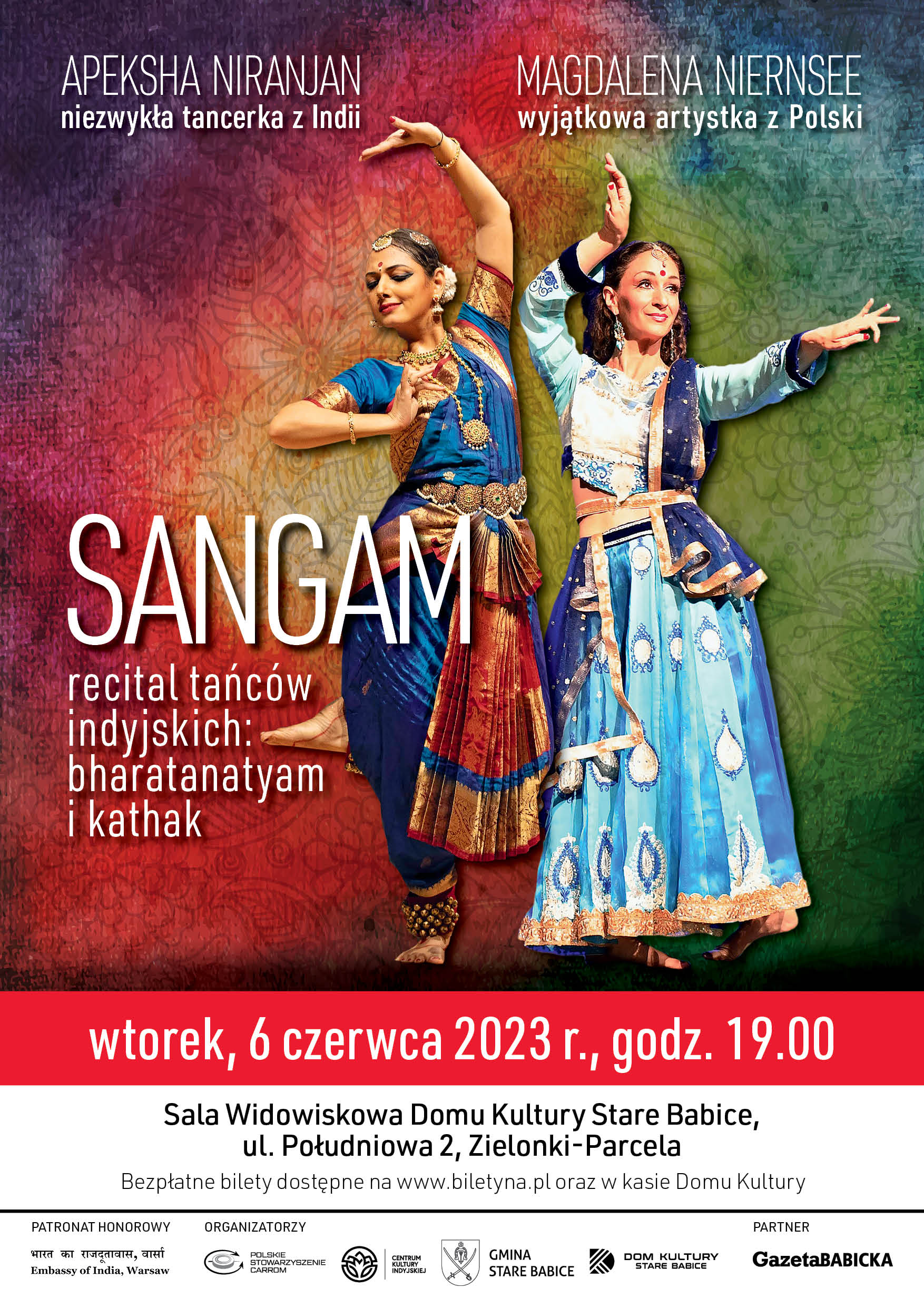 Serdecznie zapraszamy na recital klasycznych indyjskich tańców pt. SANGAM, czyli połączenie, zbieg rzek. Taniec bharatanatyam, pochodzący z południa Indii zaprezentuje wspaniała indyjska artystka - Apeksha Niranjan. Taniec z północy Indii - kathak, zobaczymy w wykonaniu polskiej tancerki Magdaleny Niernsee. Dzięki artystkom przeniesiemy się do Indii w niezwykły świat sztuki tańca. Tańca, który jest połączeniem ciała i umysłu, ekspresji i ruchu, rytmu i melodii, a czym więcej?... tego dowiecie się na miejscu.
