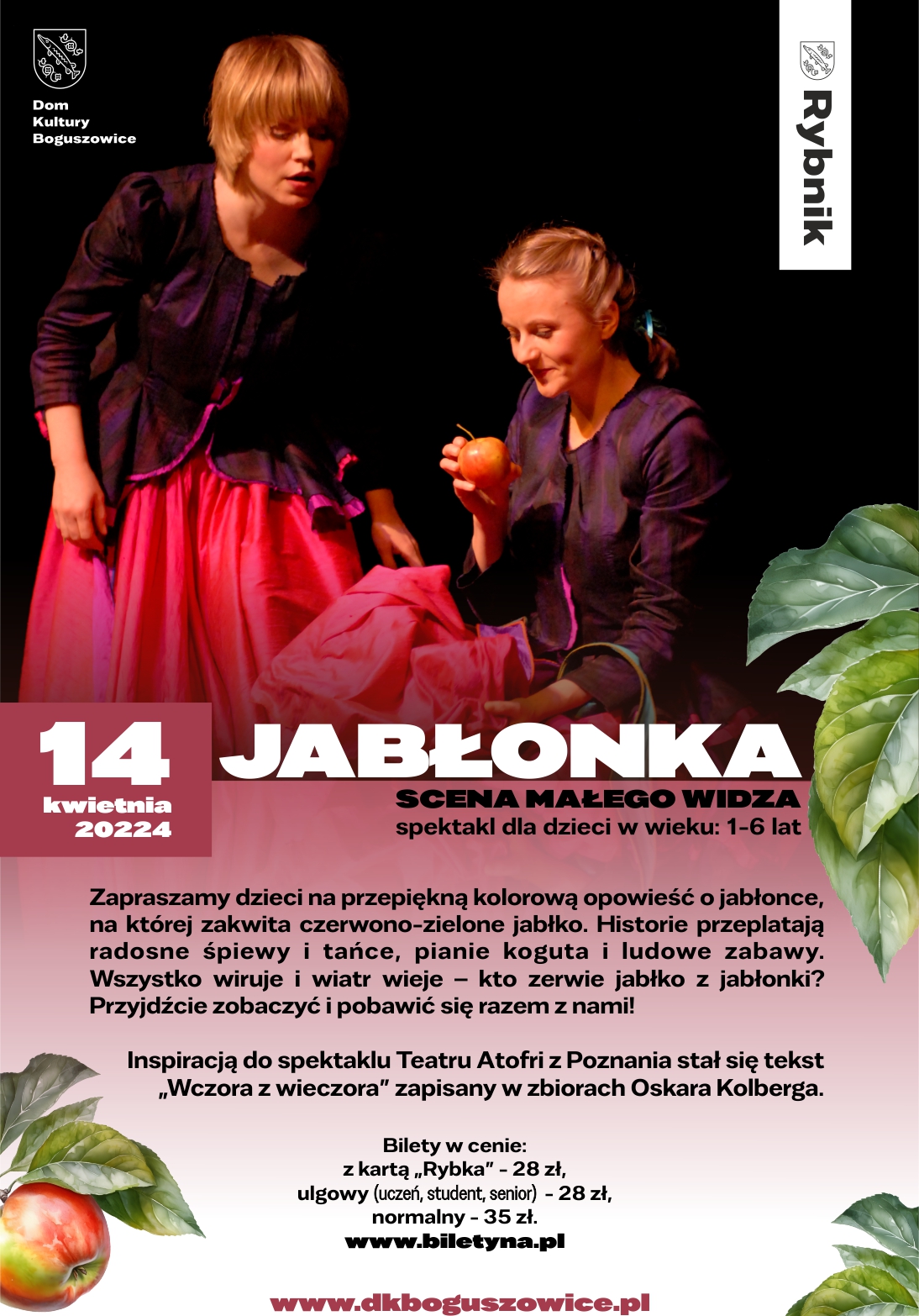 Zapraszamy dzieci na przepiękną kolorową opowieść o jabłonce, na której zakwita czerwono-zielone jabłko. Historie przeplatają śpiewy i tańce, pianie koguta i ludowe zabawy. Wszystko wiruje i wiatr wieje – kto zerwie jabłko z jabłonki?