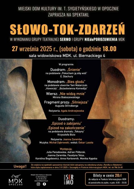 Miejski Dom Kultury im. T. Sygietyńskiego w Opocznie zaprasza na spektakl „Słowo-Tok-Zdarzeń” w wykonaniu Grupy Teatralnej SERMO oraz grupy NIEdoPOROZUMIENIA MDK.
